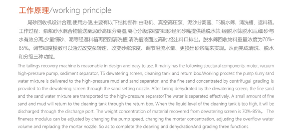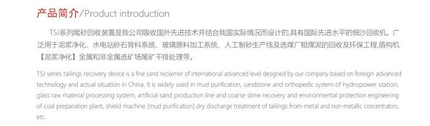 TSJ系列尾砂回收机是我公司吸收国外 技术并结合我国实际情况而设计的具有 水平的细沙回收机。广泛用于泥浆净化、水电站砂石骨科系统、玻璃原料加工系统、人工制砂生产线及选煤厂粗煤泥的回收及环保工程,盾构机(泥浆净化)金属和非金属选矿场尾矿干排处理等。