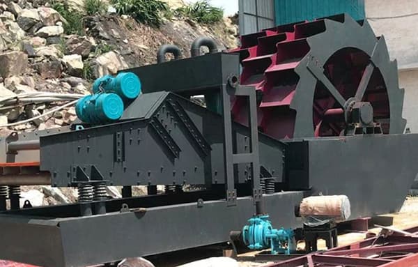 物料进入清洗箱后,在洗沙轮的带动下翻滚,与水充分接触、清洗,同时,轮子上行处的喷淋管道喷出水流,及时将杂质及比重小的异物带走,经清洗后的物料被随着洗沙轮的翻滚送至后端脱水筛,被脱去多余水分后,自出料口送至输送带。
