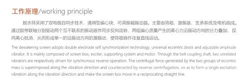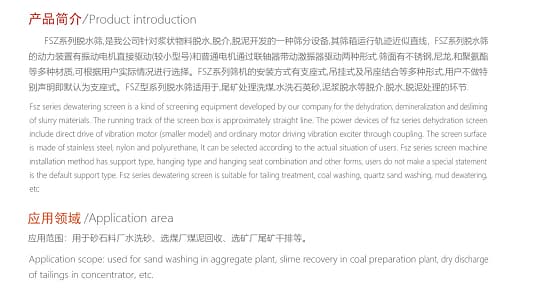 简介—— FSZ系列脱水筛是我公司针对浆状物料脱水、脱介、脱泥开发的一种筛分设备,其筛箱运动轨迹近似直线,FSZ系列脱水筛的动力装